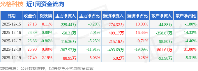 资金流向数据方面,本周光格科技主力资金合计净流出615.08万元,游资资金合计净流入409.99万元,散户资金合计净流入205.09万元。本周资金流向一览见下表: